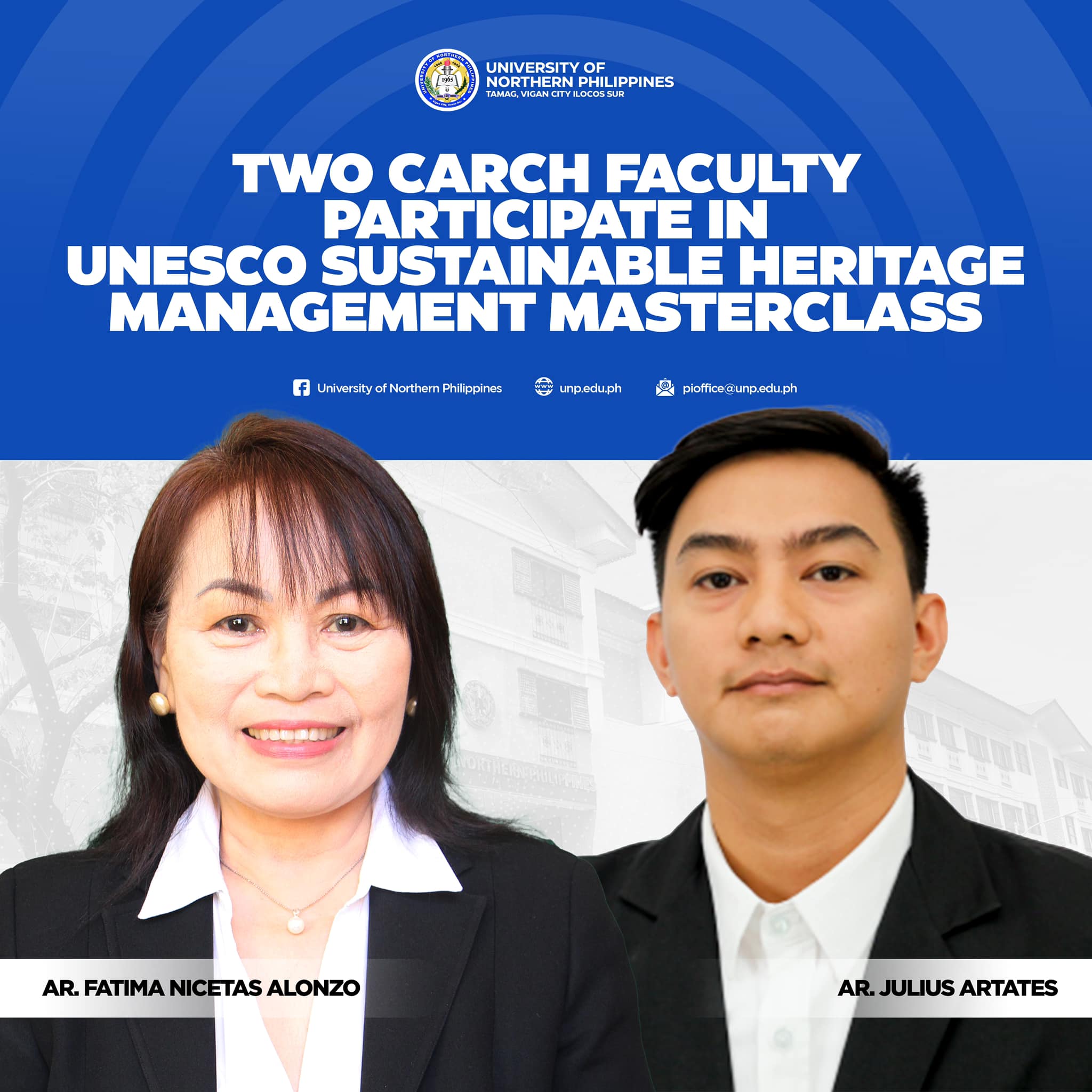 Two faculty members from the College of Architecture (CArch) will take part in a Masterclass series organized by the UNESCO titled “Innovating Models for Sustainable Heritage Management,” with the theme “Creating Shared Value through Social Enterprises.” The said Masterclass series will be held at Baan Luang Rauamaitri, Chanthaburi, Thailand from April 24 to June 2, 2024. Attendees will attend via online and onsite sessions.