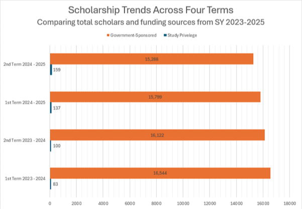 The image displays a stacked bar chart titled “Scholarship Trends Across Four Terms,” comparing total scholars and funding sources from SY 2023-2025. It illustrates the distribution of scholarships between “Government-Sponsored” (orange bars) and “Study Privilege” (blue bars) for the 1st and 2nd terms of both Academic Year 2023-2024 and Academic Year 2024-2025.