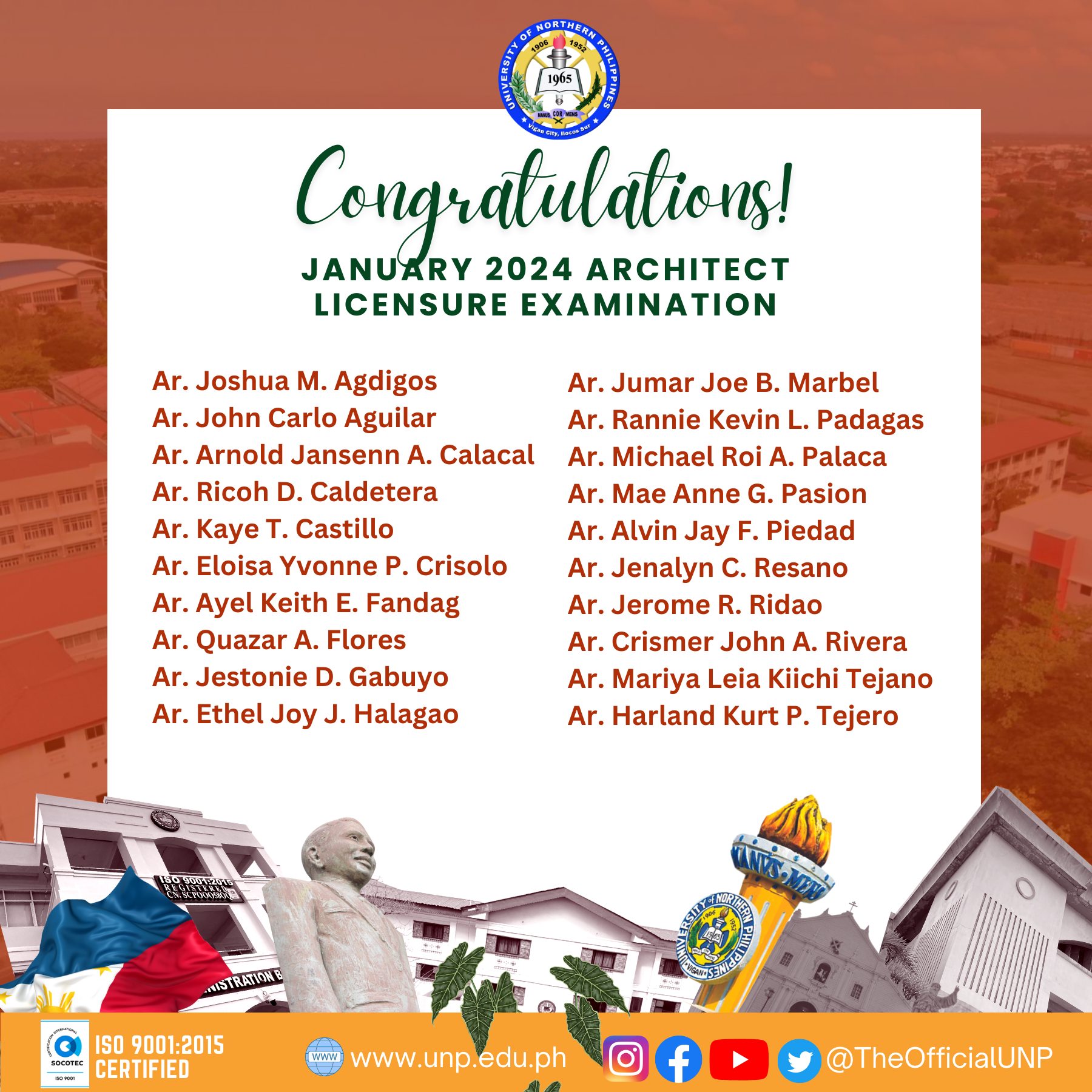 Twenty alumni of the Bachelor of Science in Architecture program of the College of Architecture emerged victorious in the January 2024 Architect Licensure Examination administered on January 24 and 26, 2024. Results were announced on January 31, 2024.